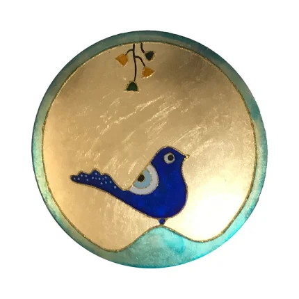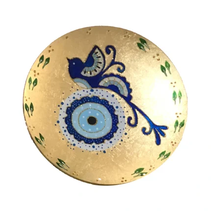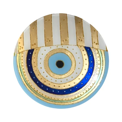 نقوش چشم نظر در مرکز بشقاب، درخشش ورق طلا و رنگهای لوکس را در خود جای داده تا جلوهای ماندگار و خاص به فضای شما ببخشد.