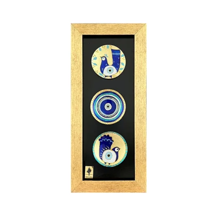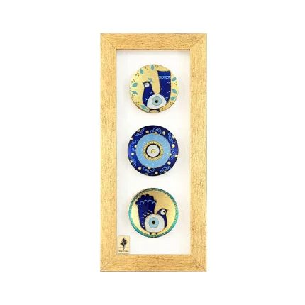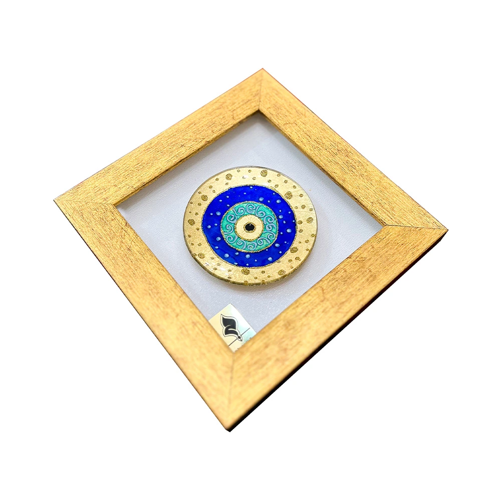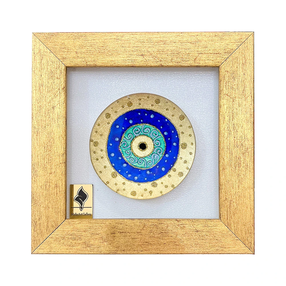 این تابلو چشم نظر با استفاده از تکنیک ویترای (نقاشی روی شیشه) و با دستان هنرمندان ایرانی ساخته شده است. ترکیب رنگهای آبی، فیروزهای و طلایی در کنار قاب طرح چوب طلاییرنگ، حس آرامش و اصالت را به فضای شما میآورد.